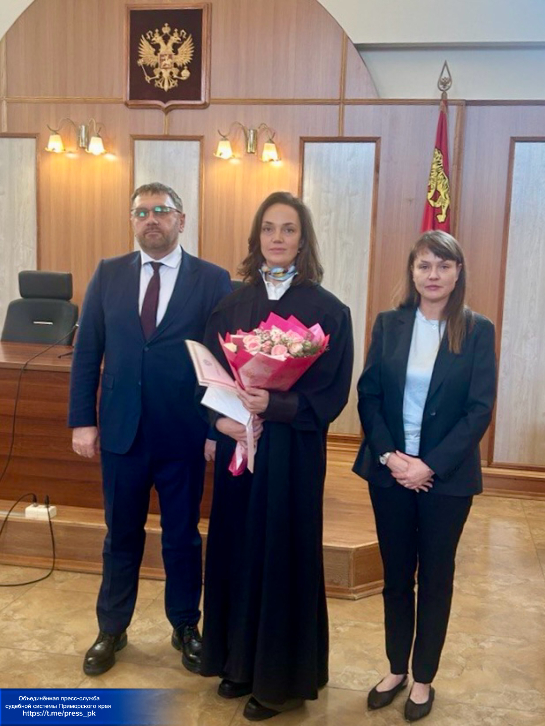 Постановлением Законодательного Собрания Приморского края от 26.11.2025 № 2226 на должность мирового судьи судебного участка №10 Первомайского судебного района г.Владивостока назначена Грушина Арина Валерьевна. На торжественном собрании заместитель председателя Приморского краевого суда Дышловой И.В. представил нового судью, врип председателя Первомайского районного суда г.Владивостока Ларичева К.Б. и мировые судьи Первомайского судебного района г.Владивостока поздравили Арину Валерьевну со вступлением в новую должность, пожелали удачи и дальнейших успехов в осуществлении правосудия. Трудовую деятельность в судебной системе Грушина А.В. осуществляет с 2011 года. До назначения мировым судьей замещала должности секретаря судебного заседания Пятого арбитражного апелляционного суда, секретаря судебного заседания и помощника судьи в Приморском краевом суде.
