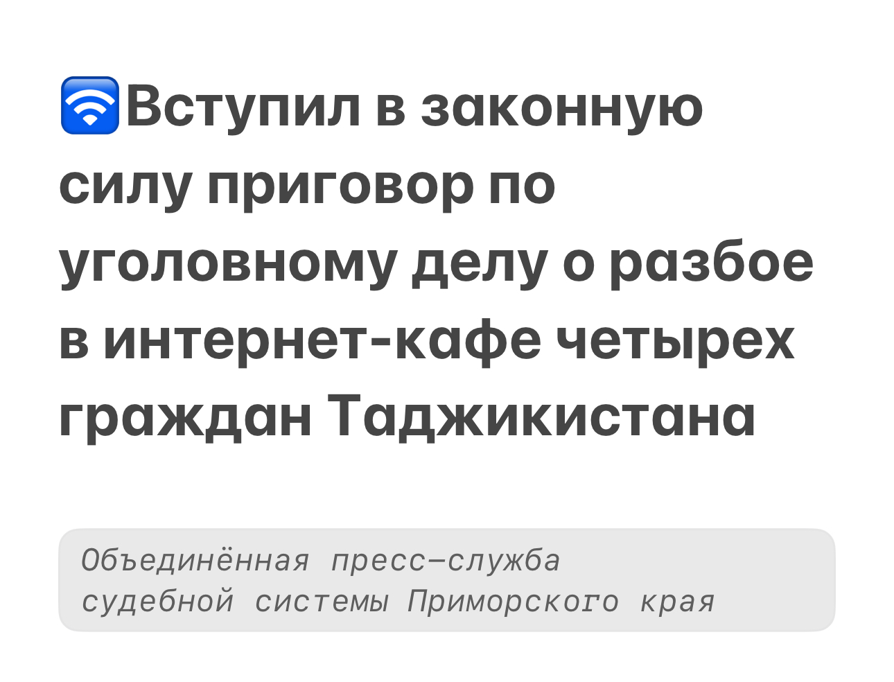 | Вступил в законную силу приговор по уголовному делу о разбое в интернет-кафе четырех граждан Таджикистана | версия для печати |